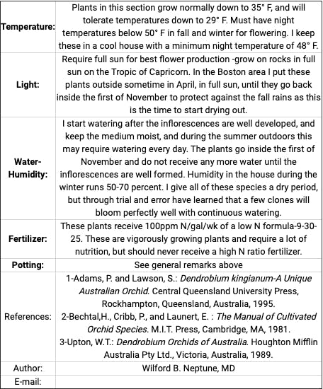 Species in this Section include: Dendrobium adae, D. aemulum, D. callitopophyllum, D. falcorostrum, D. finniganense, D. fleckeri, D. gracilicaoule, D. jonesii, D. kingianum, D. moorei, D. speciosum 11. For Discussion: Dendrobium kingianum Bidwill, Dendrobium jonesii Rendle, The Natural Hybrid-Dendrobium x delicatum F.M.Bail