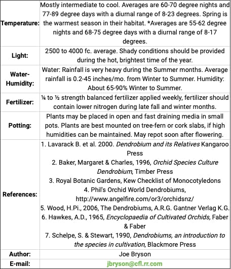This Section is closely related to Stachyobium, but with larger flowers. It is in Subgenus Dendrobium, which has plants with leaf sheaths and stems that are fleshy for their entire length. The stems are mostly slender but swollen at the base with leaves in two ranks along most of the length. This small group of species becomes completely deciduous before they produce flowers. Inflorescences are erect and occur from the top of the upright pseudobulbs. The plants are epiphytes occuring in low to moderate altitudes in areas that have a seasonal climate. The numerous flowers are large and very attractive with wide petals and a conspicuous 3-lobed lip that is broad, flat and fimbriated at the base.