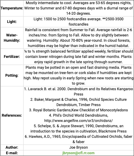 This Section appears to have two different spellings: Inobulbum and Inobulbon. I am using Inbulbum, which agrees with Lavarack (Ref.1) and the Kew Monocot List (Ref. 4). Lavarack, et.al. have elevated this Section to generic status, however, I have kept it as a Section of Dendrobium to agree with the Royal Botanic Gardens, Kew Monocot List. Section Inobulbum is in Subgenus Athecebium, which has plants with no distinct leaf sheaths on the stems. The plants are closely related to Section Tetrodon. Plants of this Section occur in rainforests in low to moderate altitudes in areas with high year-round humidities. Pseudobulbs are short and spindle-shaped with nodes that have rings of rigid hairs. Species have 2 to 3 leaves at the apex of the pseudobulbs. Flowers are on a long inflorescence. The inflorescences have numerous flowers, with 80 or more on an inflorescence. The lip is 3-lobed.