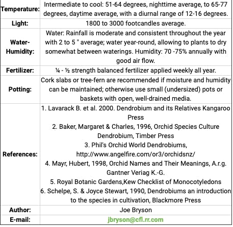Plants in this section grow as epiphytes or lithophytes at moderate altitudes (700 to 1200 meters) in mist/rain forests with year-round high humidity and fairly low light levels. The Section is most closely related to Section Macrocladium and Genus Grastidium. This section is in Subgenus Dendrobium, which contains plants with leaves born on a sheathing base and stems fleshy for the entire length. The stems are long and slender with numerous aerial plantlets in several of the species. Inflorescences have one to three or three to nine (Den. crassicaule) small flowers with a moveable, undivided lip similar to Bulbophyllum. Flowers either self-pollinate and do not open at all (Den cleistogamum) or always remain fairly closed.