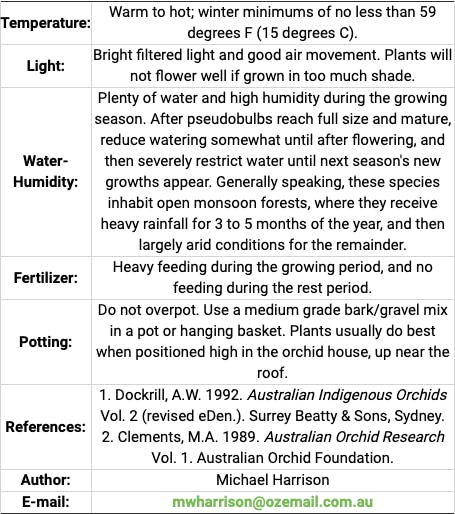 This relatively small group of sympodial, mostly epiphytic, tropical orchids contains several species of great beauty and horticultural importance. Den. phalaenopsis, the Cooktown Orchid, occurs only in the south-eastern portion of Cape York Peninsula, Queensland, but for many years this name has been erroneously applied to an Indonesian species, now correctly known as Den. striaenopsis. Both Den. phalaenopsis and Den. striaenopsis have been widely cultivated, and in combination with Den. bigibbum, another north Queensland native, have figured prominently in the breeding of "hardcane" Dendrobium hybrids, much favoured by orchid growers. In sect. Phalaenanthe, pseudobulbs may be tall (up to 80 cm.) and slender (e.g. Den. bigibbum), or short and stout (e.g. Den. lithicola), with up to 6 apical and subapical leaves. The erect, arching inflorescences arise from nodes near the top of the pseudobulbs, and carry up to a dozen large, showy, pansy-shaped flowers, in tones of white, pink and purple. Because of their popularity in cultivation, populations of these species have been severely depleted in some areas Commonly grown species include Den. bigibbum, Den. lithicola, Den. phalaenopsis, Den. striaenopsis and Den. affine.
