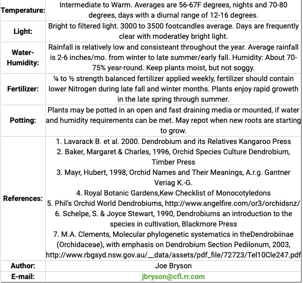 Dendrobium Section Tetrodon was recently moved into generic status by M.A.Clem.& D.L.Jones; however, the Royal Botanic Gardens, Kew Monocot List (Ref. 4.) does not recognize this as a separate genus. Species in this section are closely related to those in Section Inobulbum. The Section is in Subgenus Athecebium, which include plants without leaf sheaths. The plants occur in rainforests at moderate altitudes in areas of strong light, but year-round humidity. Pseudobulbs are short, squat, and flattened with two leaves at the apex. The few to many, medium-sized flowers occur on long racemes or sparsely branched inflorescences. Lips are 3-lobed with a prominent mentum.