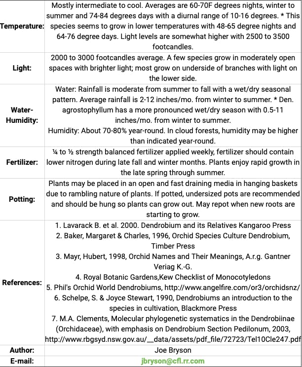 Approx. six to nine species. *Den. agrostophyllum, Den. chalmersii, Den. cyrtolobum, Den. finetianum, Den. prostheciglossum, Den. viridiflorum