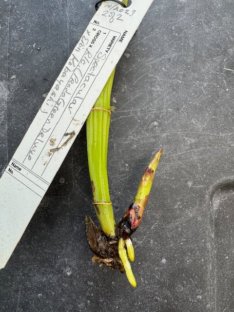 Also described in this article is the process of backbulb cultivation, which can be used in genera such as Cymbidium orchids. Backbulbs are living (not dried up) pseudobulbs that have lost their leaves. Dormant nodes, or “eyes,” can be encouraged to grow by cutting the backbulb off the parent plant and growing it in sphagnum moss or other suitable potting medium until new roots and leaves appear. Most cymbidium backbulbs are started in flats of the same potting mix used for the adult plants.