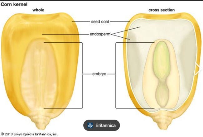 The next group of plants to arrive on Earth were the Angiosperms, the flowering plants, which appeared approximately 140 MYA. Angiosperms improved on the naked seed by wrapping it in an endosperm. See the diagram below of a corn kernel found at www.britannica.com. Endosperm is a plant tissue that provides the nutrients necessary for seed germination and growth. This increases the probability that a seed will germinate but limits the distance of seed dispersal.
