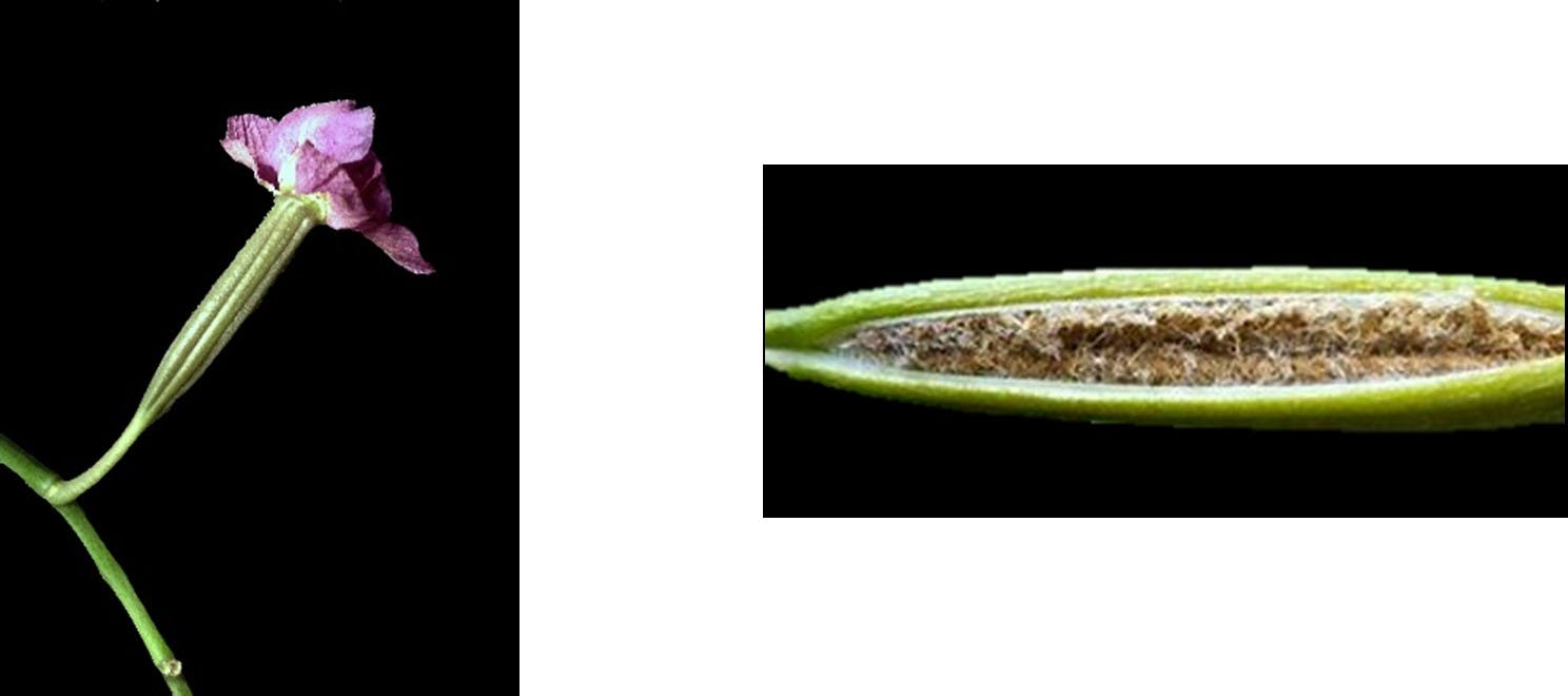 Now we come to the orchids where this discussion enters a gray area. The current theory is that Orchidaceae, a plant family within the Angiosperms, arose approximately 112 to 120 MYA. However, most orchid genera produce naked seeds inside a seed capsule. The capsule develops from the ovary of a pollinated flower. The inside of a ripe seed capsule looks sort of like dusty cotton stuffing. The “dust” is the actual orchid seeds. Once ripened, this seed capsule bursts open and disperses up to millions of tiny seeds (numbers depend on the species) in the wind. A very small percentage of these seeds will land in an area with the correct nutrients and growth conditions and germinate. Mycorrhizal fungi are responsible for providing these nutrients.