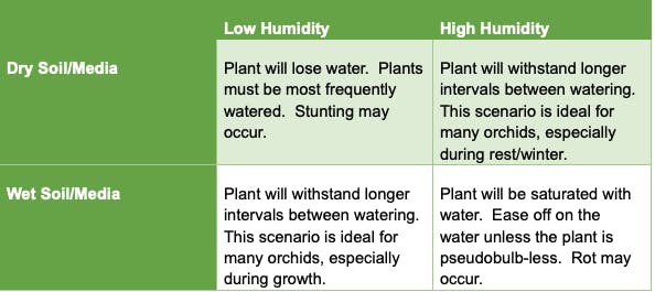 Too much water is known as “overwatering”, though it’s really a misnomer. Overwatering is really when the media that the orchid is growing in does not dry out fast enough. This can be from too frequently watering, adding too much water, or from other conditions that affect transpiration and evaporation from the media like – not enough airflow, too high humidity, or not enough light. Remember, an environment is in cyclic flux, so it’s not just about how much water you are adding, but also how much water is leaving!